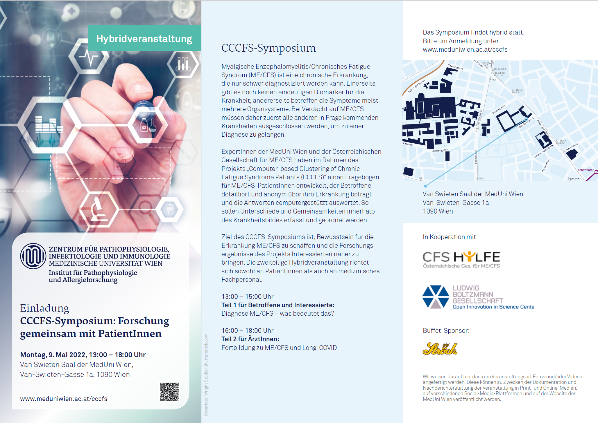 Im Mai 2022 fand das CCCFS Symposium in hybrider Form statt, bei dem Bewusstsein für ME/CFS geschaffen wurden, sowie Forschungsergebnisse präsentiert wurde. Die Veranstaltung richtete sich sowohl an PatientInnen als auch an medizinisches Fachpersonal. Eine Nachschau des CCCFS Symposiums gibt es auf der CCCFS Projektseite.